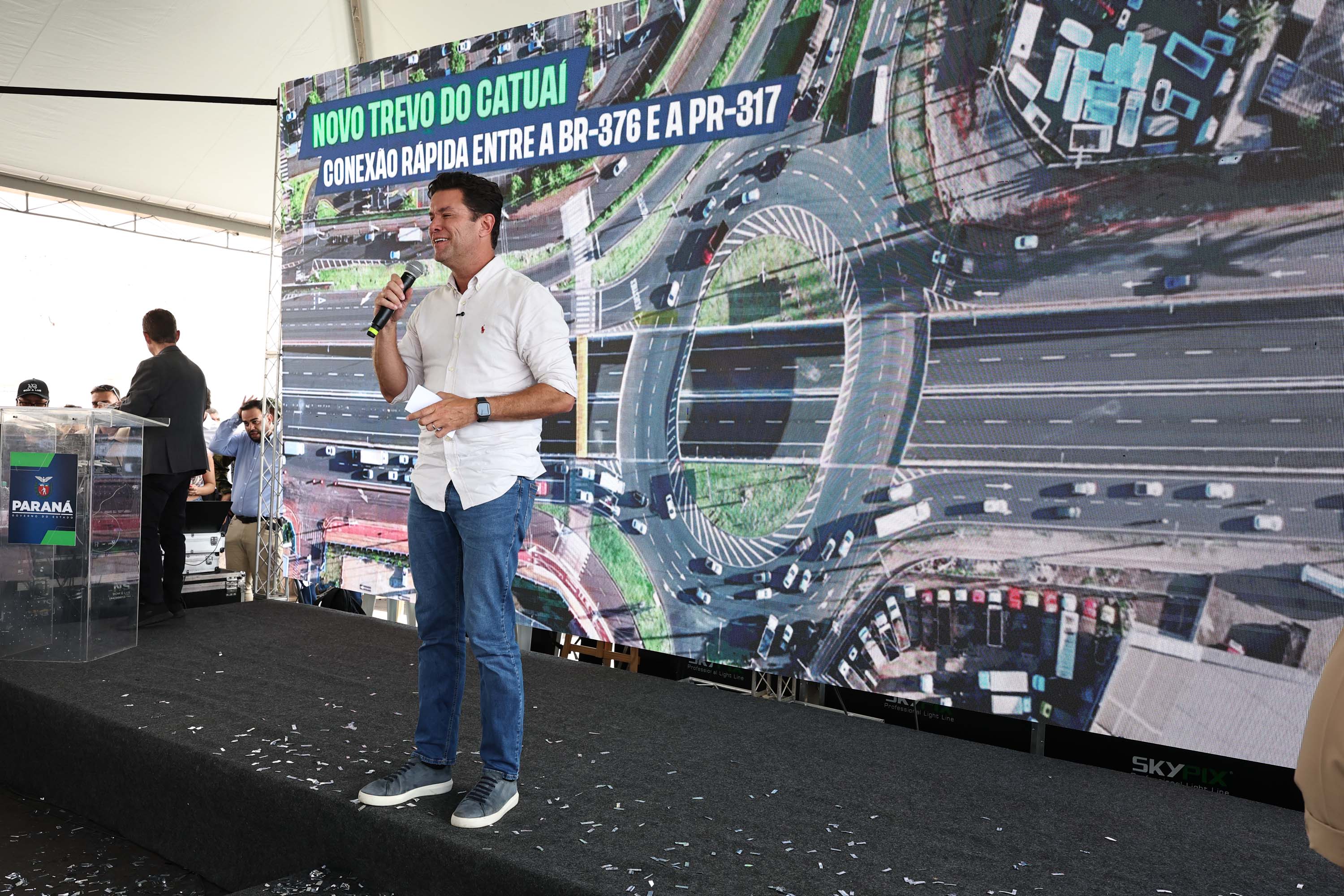 “Estamos trazendo a solução para a BR-376, para a BR-317 e a avenida principal. Era um gargalo importante e nós assumimos o compromisso de trazer a solução para uma cidade planejada, mas que neste trecho tinha um grande entrave”, afirmou o secretário de Infraestrutura e Logística, Sandro Alex, apontando ainda que a duplicação da BR-317 já está sendo executada.