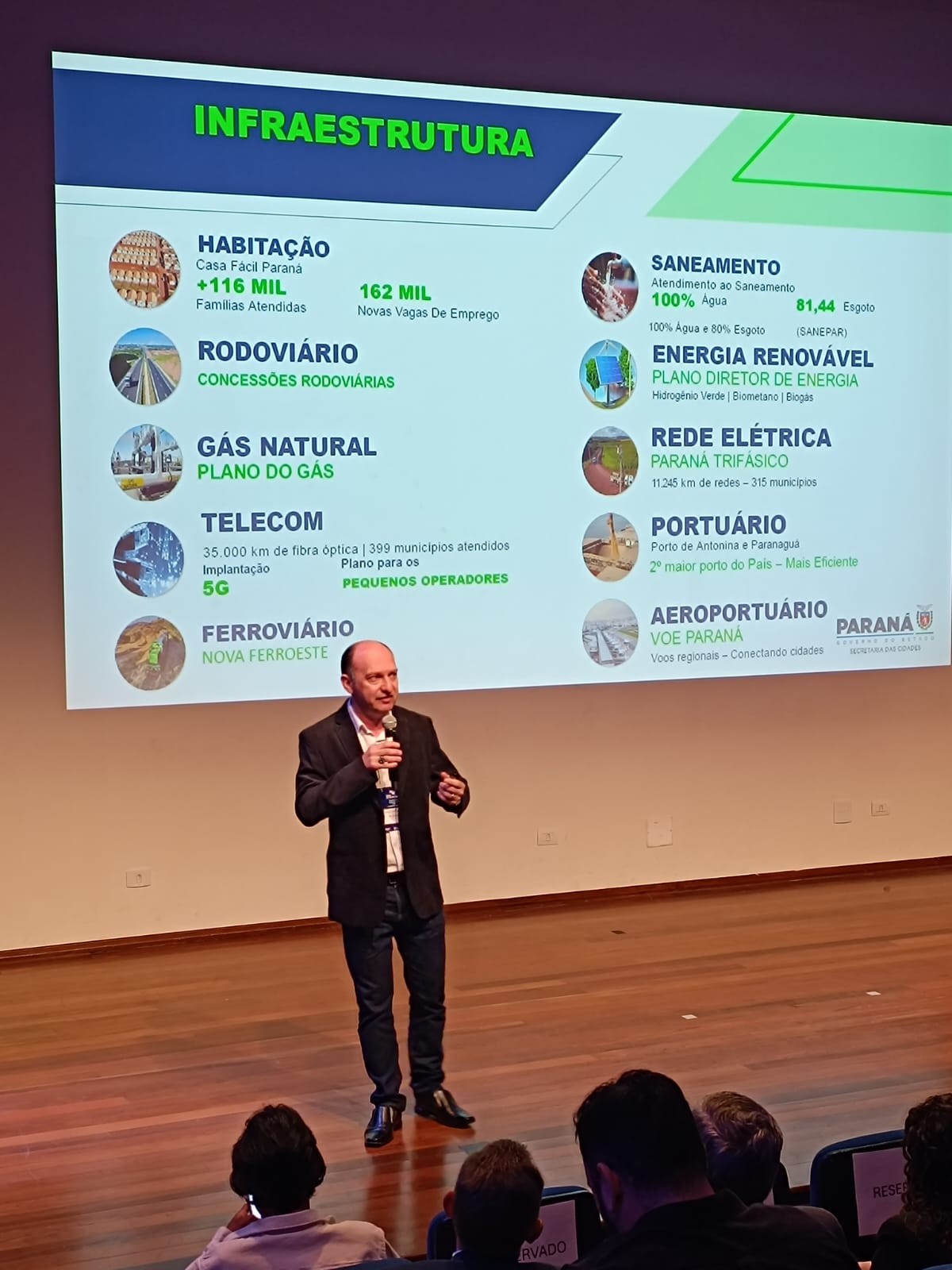 Dentre as ações e programas do Governo do Estado via Secid, Marini falou sobre o Asfalto Novo, Vida Nova, maior programa de pavimentação do Brasil, e o Ilumina Paraná, primeiro programa para substituição de 100% da iluminação pública para a LED. “Já foram investidos mais de R$ 4 bilhões e deve alcançar R$ 5,4 bilhões para atender todas as etapas do programa Asfalto Novo, Vida Nova, que iniciou em 2023 com municípios com até 7 mil habitantes e hoje já atende cidades com mais de 100 mil habitantes”, disse Marini. “Além do Asfalto Novo, Vida Nova, existe o Programa Pavimenta Mais, que conta com investimento de R$ 977 milhões para pavimentação asfáltica sobre pedras irregulares”, lembrou o diretor da Secid.
