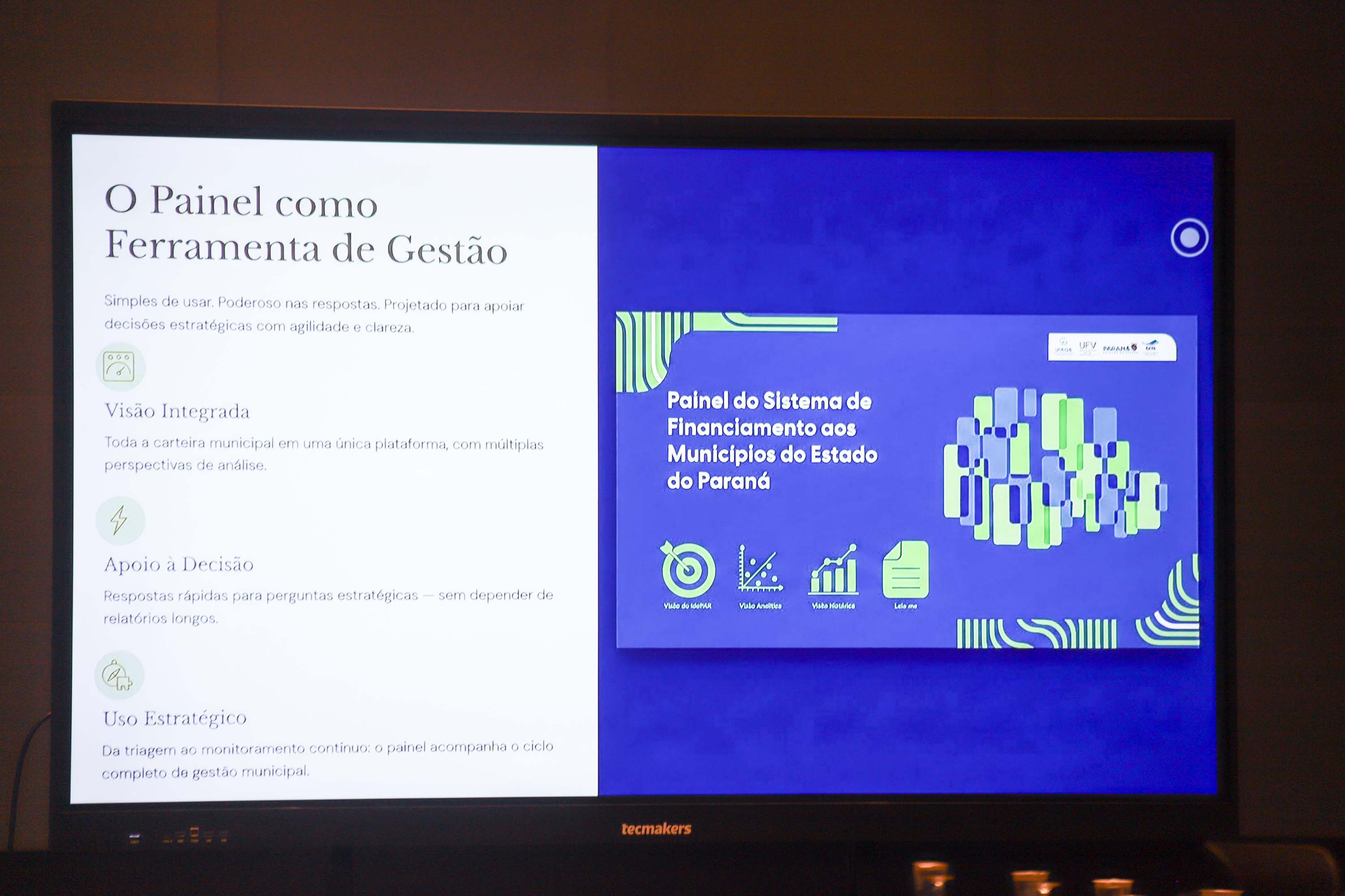 PAINEL DE MONITORAMENTO – Durante o evento foi apresentado o Painel de Monitoramento do Financiamento dos Municípios do Paraná, uma ferramenta estratégica para apoiar decisões sobre a carteira de projetos municipais - gerido pelo Paranacidade. O painel pode ser acessado AQUI